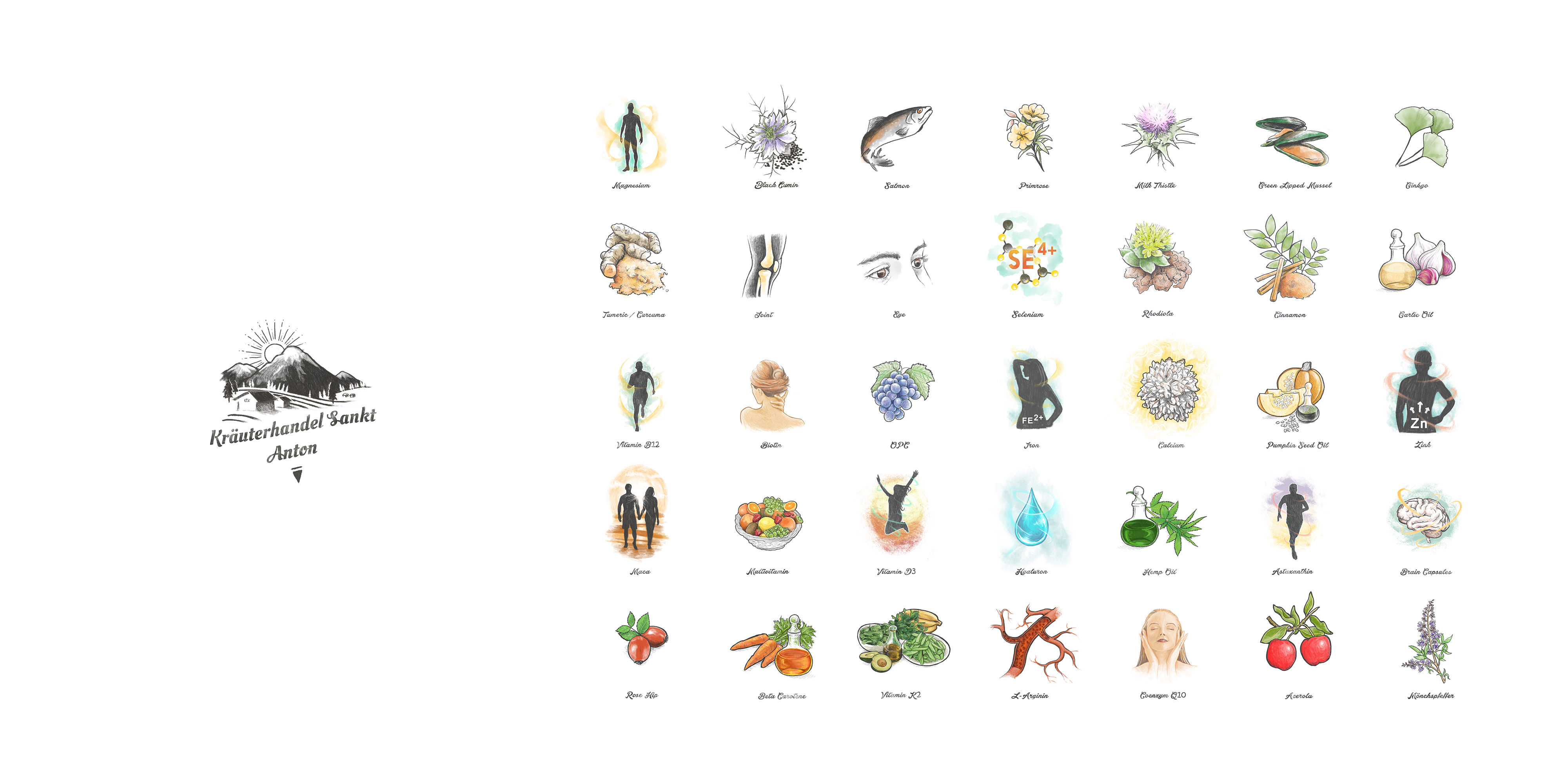 Logo and illustrations for each vitamin bottle